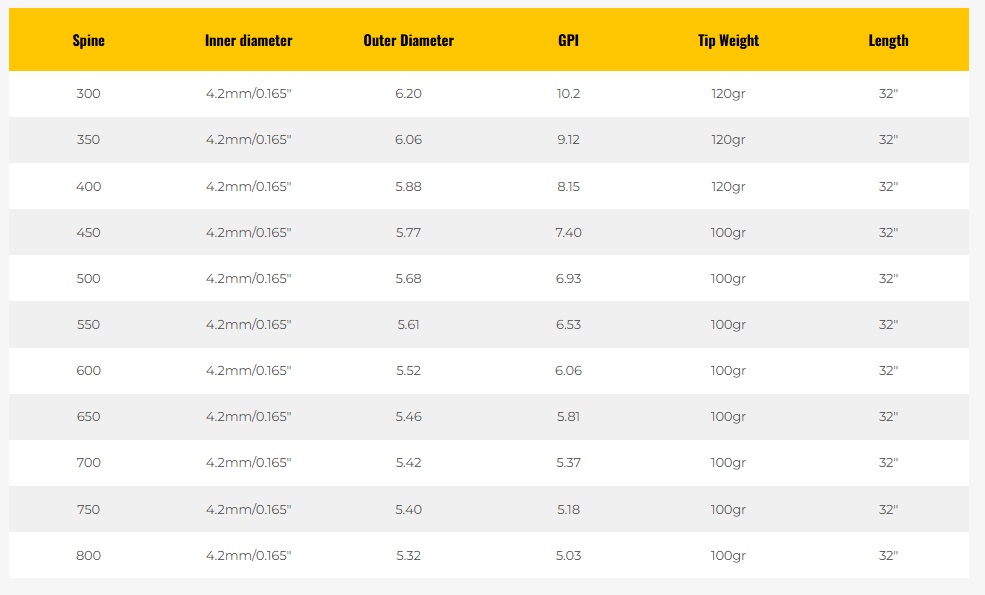 The champion series is available with 11 spines from 300 to 800 providing a choice of across every division with an extremely tight .001” straightness spec.